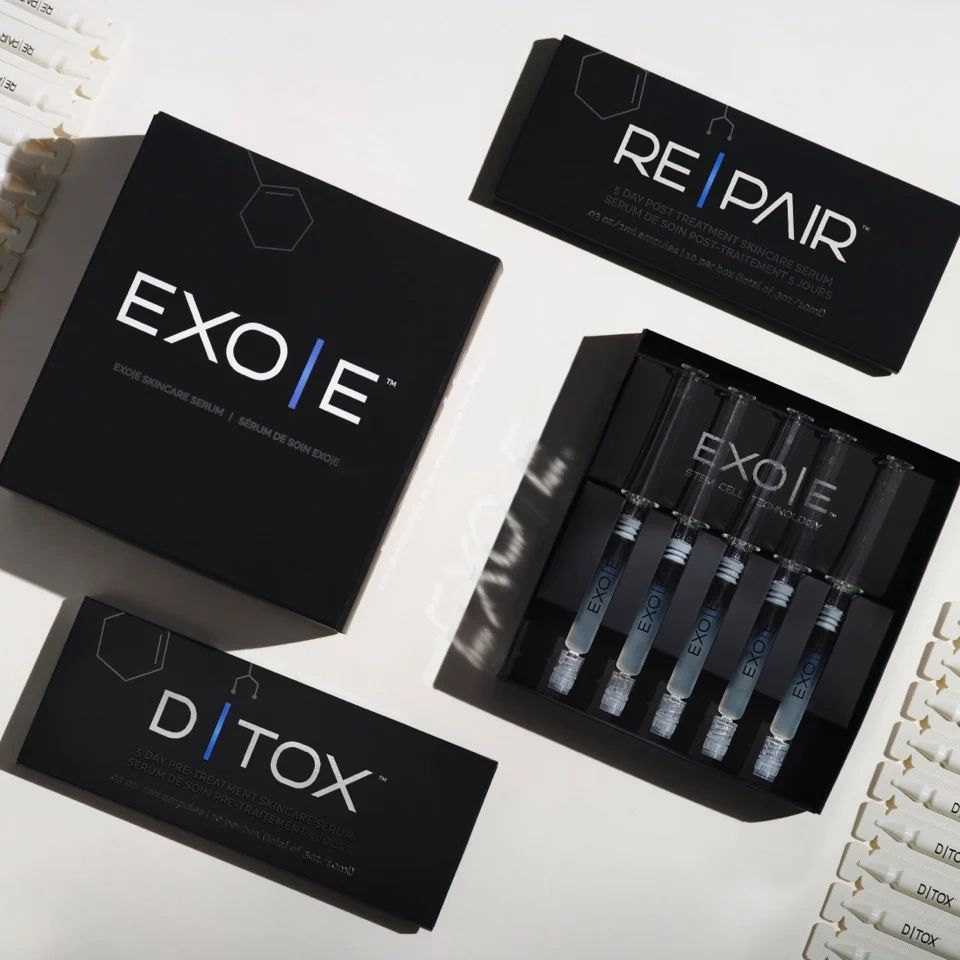 You will start with a 7 day D|TOX treatment done at home daily prior to your EXO|E in office treatment, so be sure to schedule your appointment ahead of time and swing by the office to pick up your Detox serum! You will follow up your EXO|E treatment with RE|PAIR serum to optimize results.